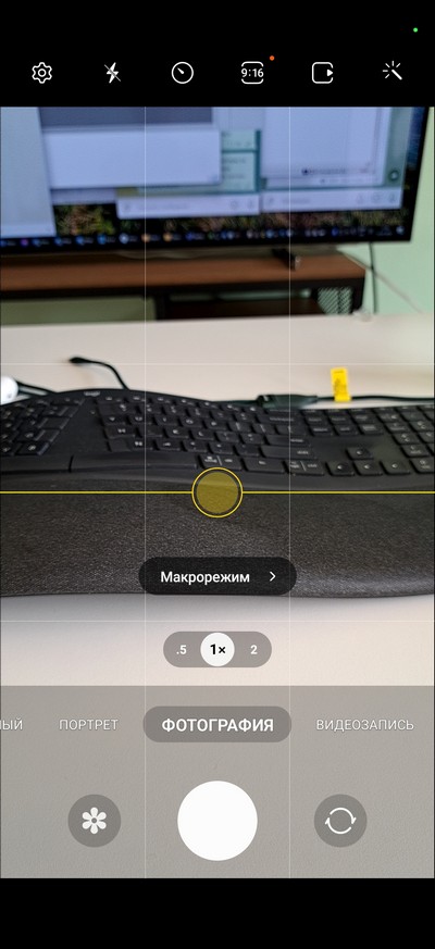 Интерфейс камеры. Сверху - пиктограммы быстрых настроек и общих настроек. В нижней части экрана - переключения между двумя камерами и цифровым (то есть просто кадрирование) двукратным увеличением. Еще ниже - переключение между режимами съемки. При смене камеры появляются пиктограммы двух камер и различных цифровых увеличений.