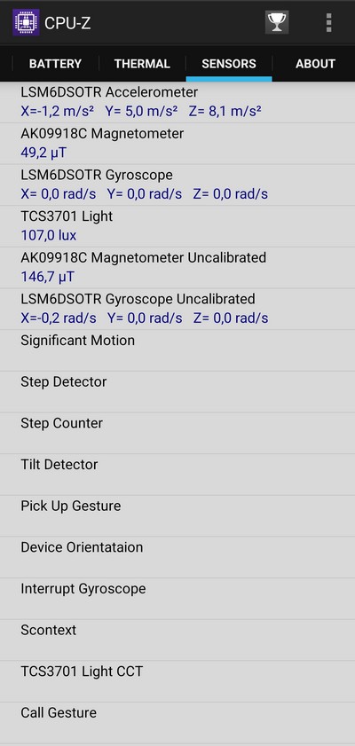 Дополнительно: акселерометр, гироскоп, датчики - геомагнитный, освещенности, виртуального присутствия, стереодинамики