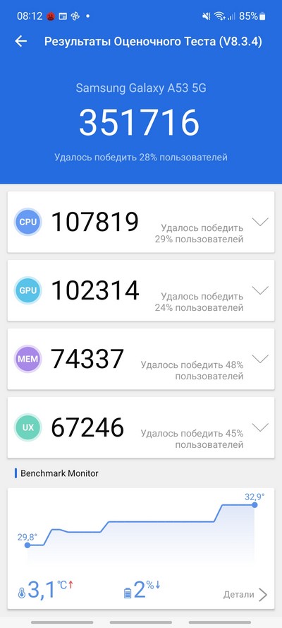 Что мы тут видим в сравнении с предыдущей моделью? В отличие от ситуации с A52 в сравнении с A51 тут улучшения скорее косметические. Платформу заменили с Qualcomm Snapdragon 720G на более высокотехнологичную Exynos 1280, что сразу вызвало стенания у некоторых обозревателей, которые помнят прошлые проблемы Exynos - невысокую производительность, нагрев, троттлинг, - однако сразу скажу, что с этим тут как раз все в порядке.
