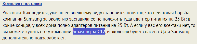 Упаковка. Как водится, уже по ее внешнему виду становится понятно, что неистовая борьба компании Samsung за экологию заставила ее не положить туда адаптер питания на 25 Вт: в конце концов, у всех дома полно адаптеров питания на 25 Вт. А если у вас его все-таки нет, то вы можете купить его у компании Samsung за €12, и экология будет спасена. Да и Samsung дополнительно подзаработает.