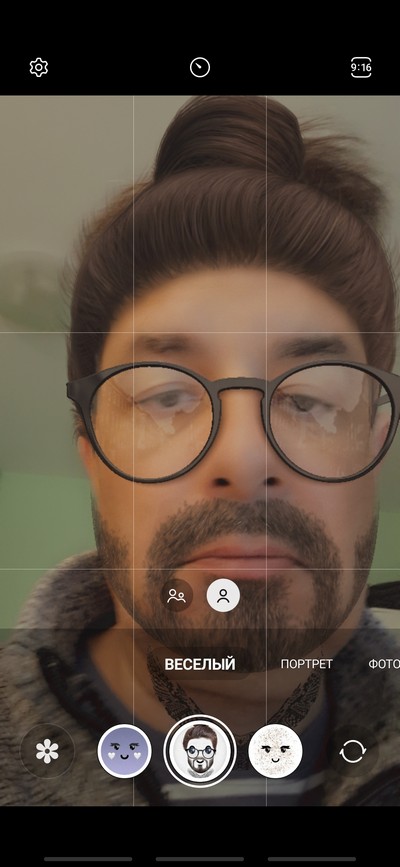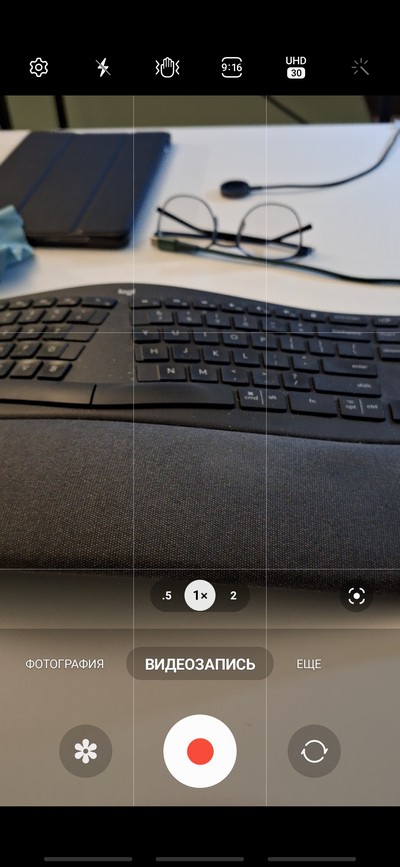Интерфейс камеры. Сверху - пиктограммы быстрых настроек и общих настроек. В нижней части экрана - переключения между двумя камерами и цифровым (то есть просто кадрирование) двукратным увеличением. Еще ниже - переключение между режимами съемки. При смене камеры появляются пиктограммы двух камер и различных цифровых увеличений.