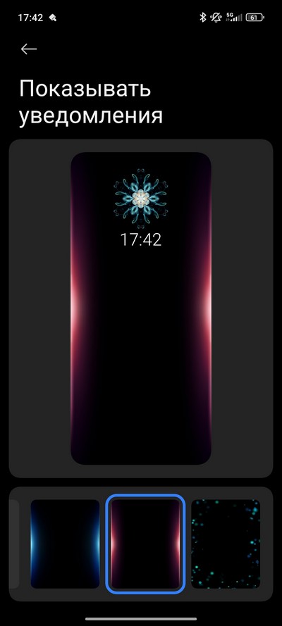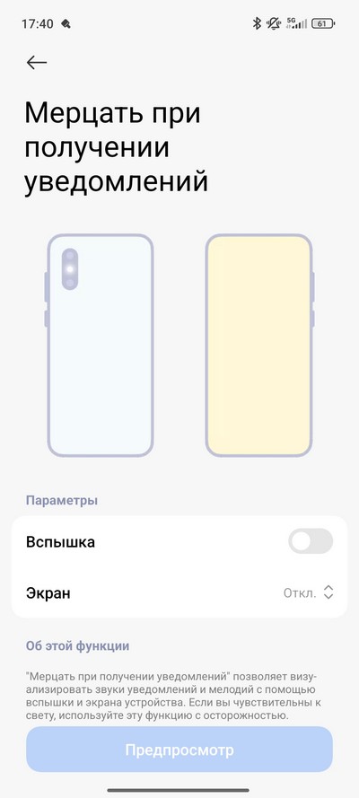 Как и раньше, поддерживаются световые уведомления по краям экрана - это очень удобная возможность. Также есть и другие виды световых уведомлений: сигнализация вспышкой, изменением цвета экрана.