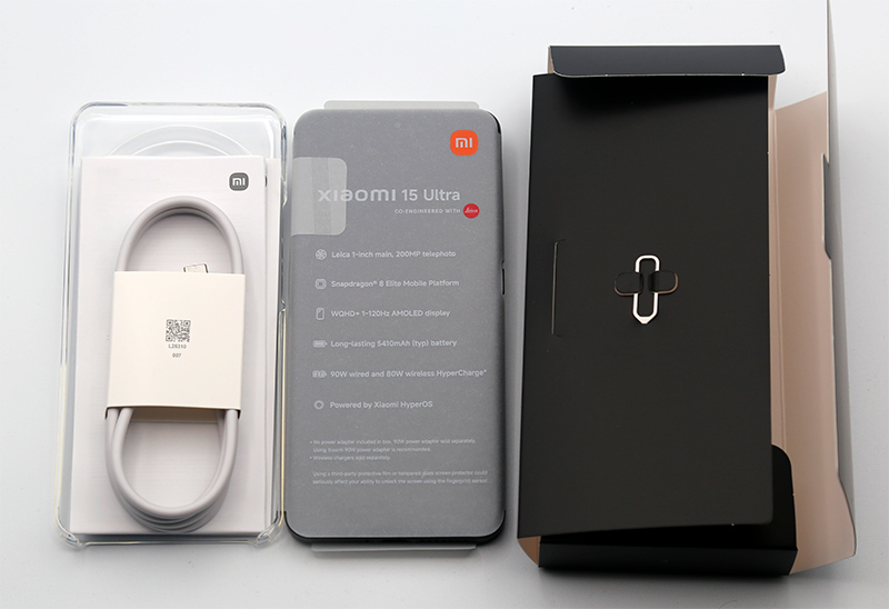 Традиционное для этих флагманов оформление коробки: надпись серебристым на черном. С надписью о сотрудничестве с Leica. У предыдущей модели внизу была надпись о поддержке 5G, здесь надпись о том, что смартфон работает на Xiaomi HyperOS (прошлая модель также имела эту оболочку, но первую версию, а здесь - вторая).