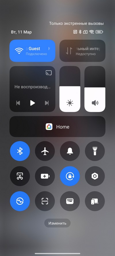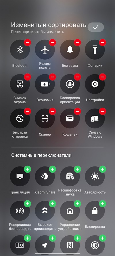 Центр управления, область быстрых переключателей и их настройка.