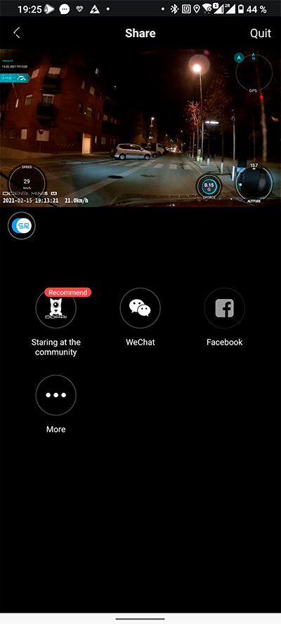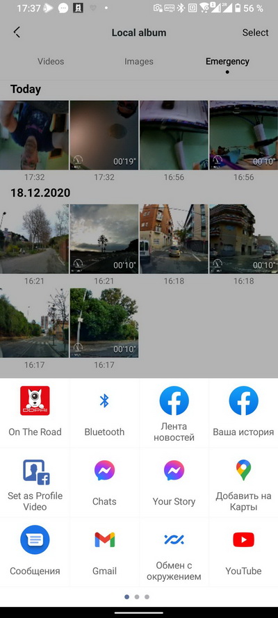 Правый скриншот - поделиться роликом в сообществе DDPai, в Wechat, Facebook, ну и по кнопке More - поделиться где угодно как угодно: например, закинуть в облако, в папку видео на смартфоне или папку Download на смартфоне.