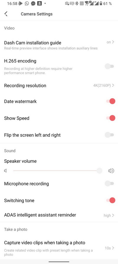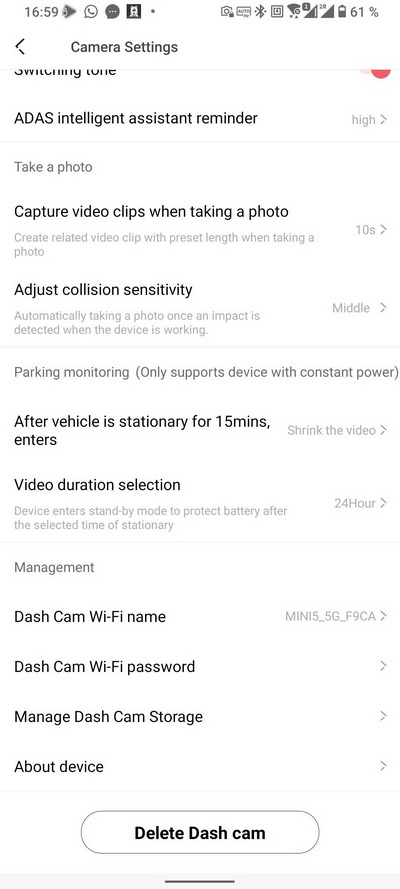 Своего монитора у видеорегистратора нет, поэтому настройка угла наклона и параметров записи производится через приложение DDPai, которое есть и под Android, и под iOS.