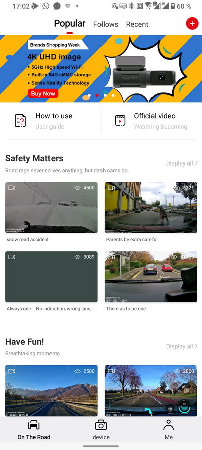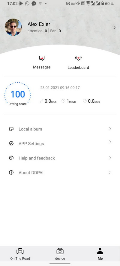 Главная страница приложения (On the Road) и профиль пользователя. В закладке On The Road пользователи делятся своими роликами, снятыми на видеорегистраторы DDPai.