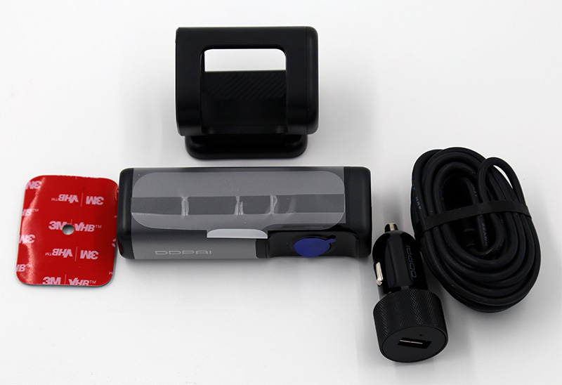 Комплект поставки: видеорегистратор, кронштейн для крепления, адаптер питания, кабель, запасной двухсторонний скотч 3M для крепления кронштейна (второй на кронштейне), инструкция на китайском.