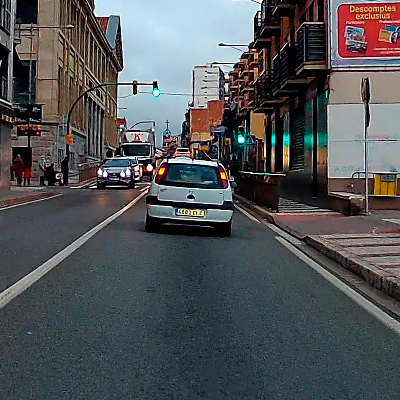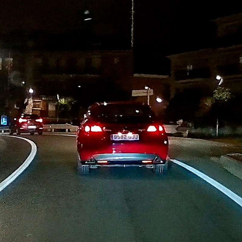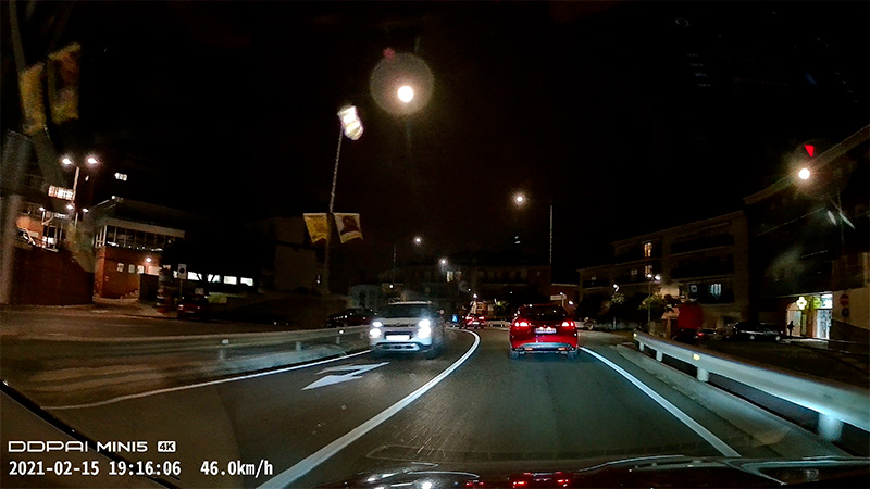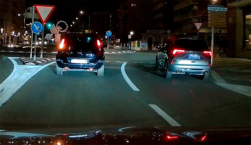 Замечу, конечно, и здесь, как у любых других видеорегистраторов, есть эффект засветки номера: если номер впереди едущей машины расположен достаточно низко и на него прямо попадает свет фар вашей машины, то там, конечно, ничего не будет видно. Вот кусок из того же ролика: у левой машины номер засвечен фарами моей машины, у правой номер нормально читается.