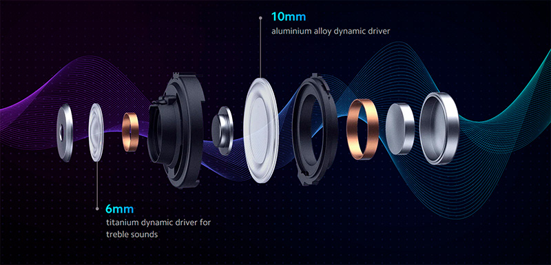 Теперь о звучании. Здесь установлены два динамических драйвера: основной 10-мм драйвер из алюминиевого сплава и титановый 6-мм драйвер для верхних частот.
