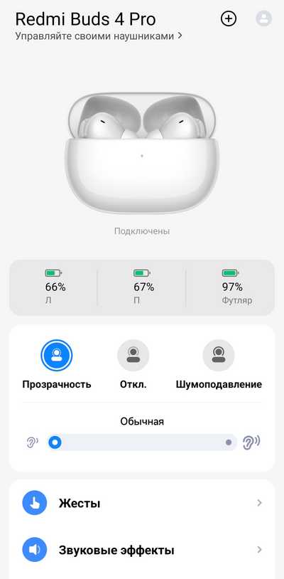 Главная страница приложения: уровни заряда наушников и кейса, режимы шумодава, настройки, звуковые эффекты, расширенные настройки и обновление прошивки.