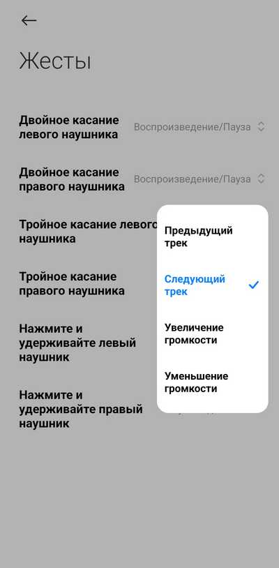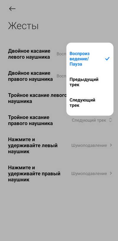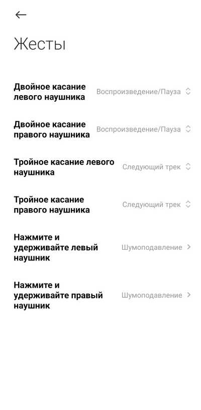 Настройки управления довольно гибкие. Ну и отмечу, что на одиночные касания наушники никак не реагируют, и это очень даже правильно!