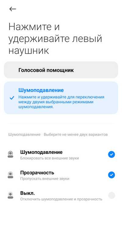 Режим прозрачности и режим шумоподавления: в каждом из этих режимов есть свои настройки.