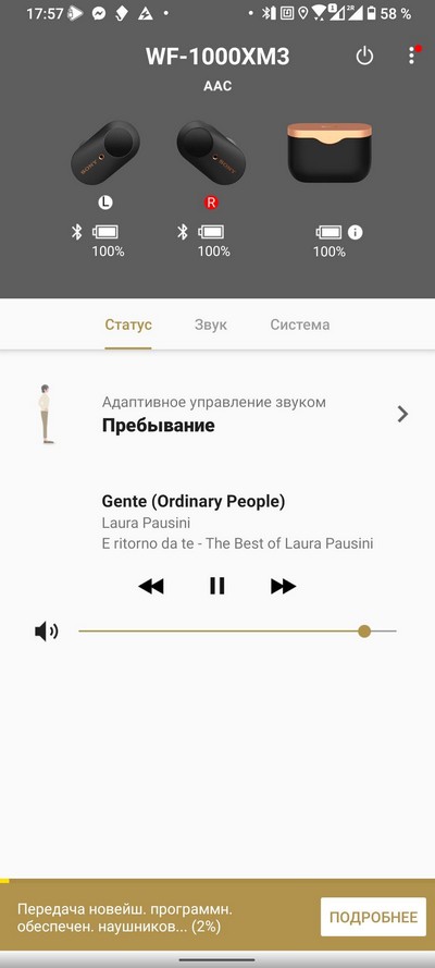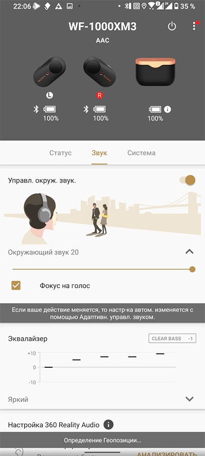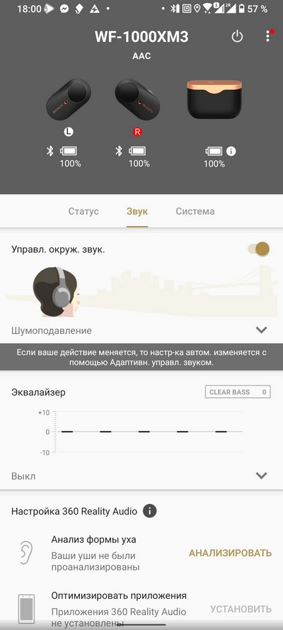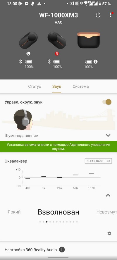 Также здесь реализовано так называемое "адаптивное управление звуком" (оно включается в настройках приложения) - это когда наушники сами оценивают, в каких условиях ты находишься (дома в тихом окружении, дома в шумном окружении, на улице, на прогулке и так далее), и, соответственно, настраивают свою работу.
