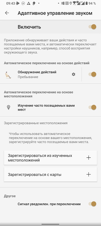Но здесь, конечно, все интереснее, чем просто режим работы шумодава. Потому что, как и у Sony WH-1000X M3, здесь есть режим Ambient sound, то есть "Окружающий звук", а также есть возможность автоматически подстраивать режим шумодава под соответствующее окружение, и это работает очень интересно. Но такие вещи тут настраиваются только через приложение, и мы об этом поговорим чуть ниже, где я как раз и буду рассказывать о том, что здесь можно сделать с помощью приложения.