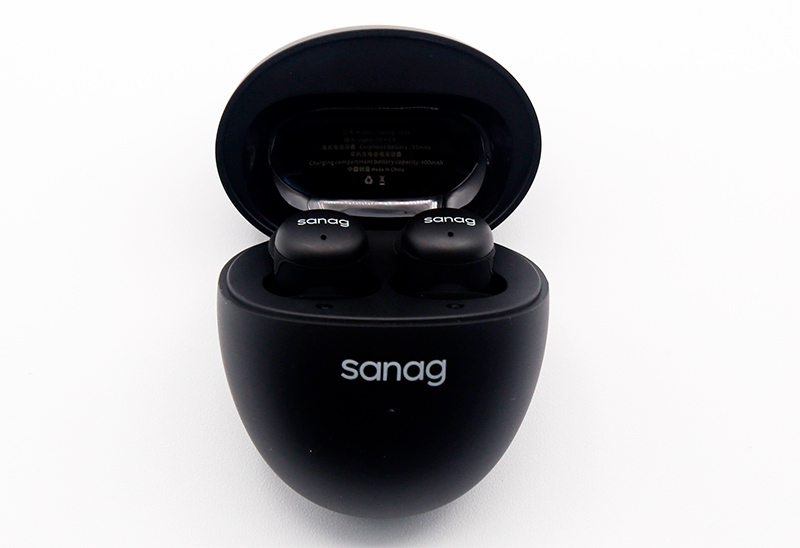 Порт Type-C для зарядки находится у зарядного кейса внизу. Под надписью "Sanag" располагается светодиод, который показывает процесс зарядки.