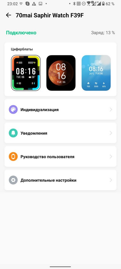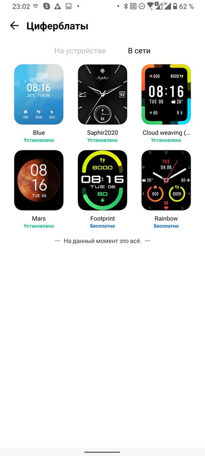 Подключенные часы в приложении. С циферблатами пока совсем негусто: их всего шесть. Видимо, количество будет увеличиваться, но пока что есть - то есть.