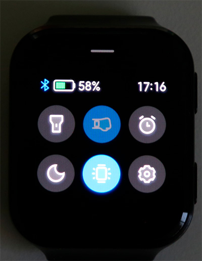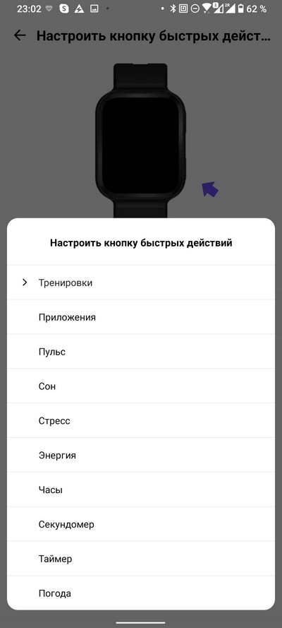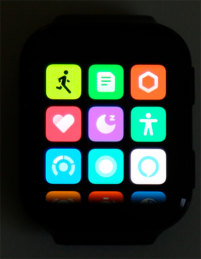 Нажатие верхней кнопки, когда выведен циферблат - все приложения. Давайте их перечислим: тренировка, история тренировок, активность, пульс, сон, энергия, уровень стресса, успокаивающие дыхательные упражнения, голосовой помощник Alexa (работает не во всех регионах), будильник, секундомер, таймер, плеер, погода, атмосферное давление, компас, сообщения, найти телефон, фонарик, помощник, настройки.