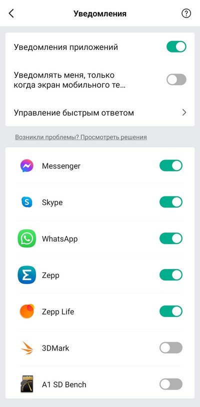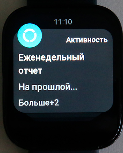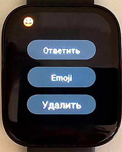 Свайп от циферблата вверх - список пришедших уведомлений (большое уведомление можно раскрыть и прочитать). На любое уведомление можно ответить предустановленной фразой (они настраиваются в приложении) или смайликом из списка.