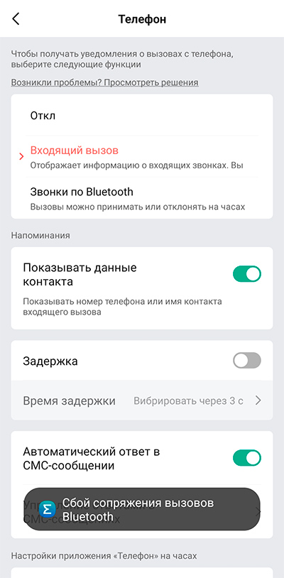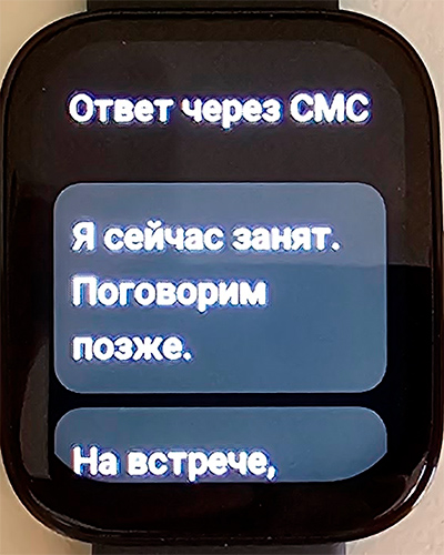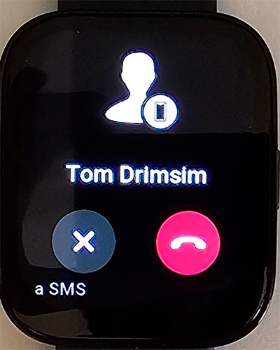 Входящий вызов можно сбросить. (Как я упоминал выше, возможности ответить на вызов СМС или принять его на часах - не работают. Ну то есть СМС типа как можно отправить, но оно никуда не приходит.)
