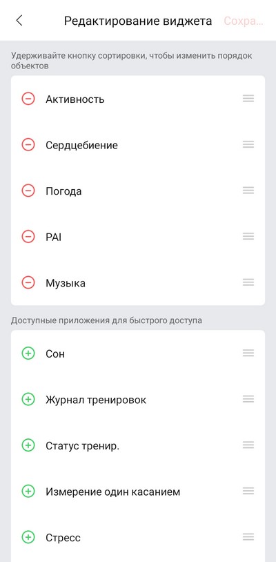 Режим сна, редактирование набора виджетов.