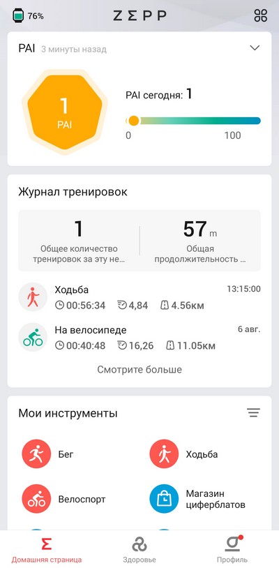 Домашняя страница приложения с измеренными часами данными.