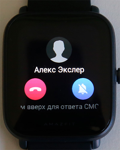 Входящий звонок. Можно сбросить звонок, отключить звонок в смартфоне. При этом я там с неимоверным удивлением обнаружил предложение сделать свайп вверх и ответить предустановленным сообщением в SMS (никогда такого не было в часах подобного уровня), и там даже выдался список сообщений на английском, а при нажатии на одно из них появилась надпись "сообщение отправляется", но на вызываемый смартфон никакое сообщение не приходит, я несколько раз проверил.
