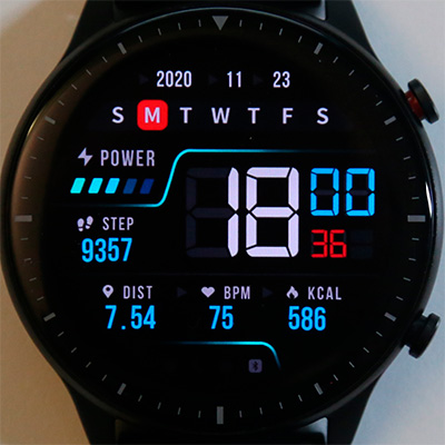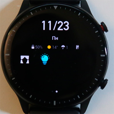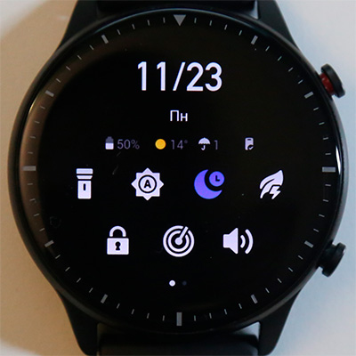 Свайп циферблата вниз - информационные данные (дата, день недели, заряд аккумулятора, погода, сопряжение со смартфоном) и пиктограммы переключаталей: фонарик, настройка дисплея, режим "Не беспокоить", энергосберегающий режим (при этом на экране будет только уровень заряда, дата, время и количество шагов, также часы будут отслеживать сон; постоянно включенного экрана не будет, активизироваться часы будут только по кнопке), блокировка экрана от нажатий (для плавания), поиск телефона (он будет звонить), настройка громкости динамика, режим "Театр" (яркость экрана гаснет, и отключается режим постоянно включенного экрана и включение циферблата подъемом запястья) и постоянное включение дисплея в полном режиме (это работает только ограниченное время).