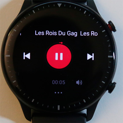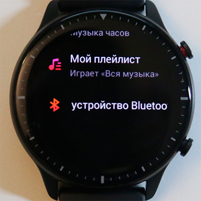 Аудиоплеер, снизу настройка - выбор источника (часы умеют играть треки из собственной памяти, где доступно 3 ГБ, с телефона, также умеют выводить звук при проигрывании с часов на беспроводные наушники).