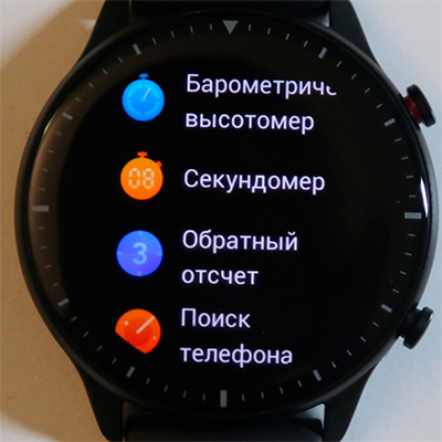 Виджеты - вот это совсем полный дурдом с точки зрения интерфейса. Потому что после виджетов идут настройки - и все. Что за виджеты - непонятно было совершенно, потому что виджеты показывались слева/справа от циферблата. А это что? Оказалось, что это типа папки для еще нескольких приложений: барометр, секундомер, таймер и поиск телефона. Почему их нужно было скрывать под "виджетами", а не просто дать в общем списке приложений, тем более что этот список настраивается через смартфон, непонятно совершенно. Но тут вообще с интерфейсом есть очевидные косяки: видимо, торопились выпустить.