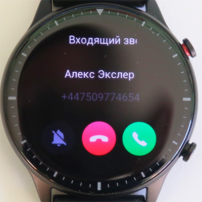 Входящий телефонный звонок: можно выключить звук, отклонить звонок, принять прямо на часах. При негромком окружении слышимость очень хорошая: и у часов динамик достаточно громкий, и меня абоненты слышали хорошо.
