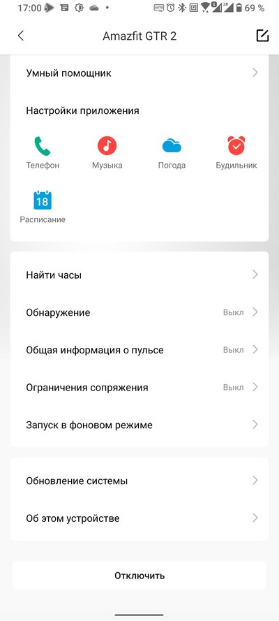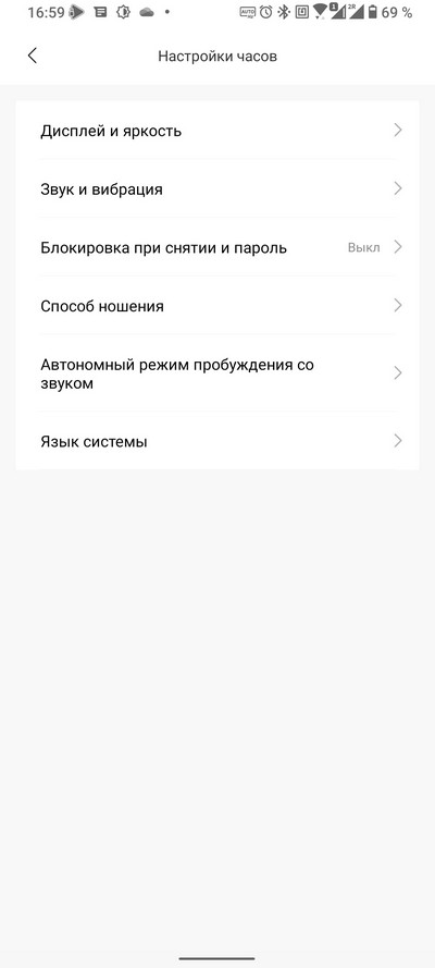 Настройки - там в основном то, что настраивалось в приложении, плюс тут на нижнюю кнопку можно навесить не тренировки, а какое-то другое приложение. Также замечу, что режим "Постоянно включенный дисплей" может автоматически выключаться во время сна, что, конечно, очень даже правильно.