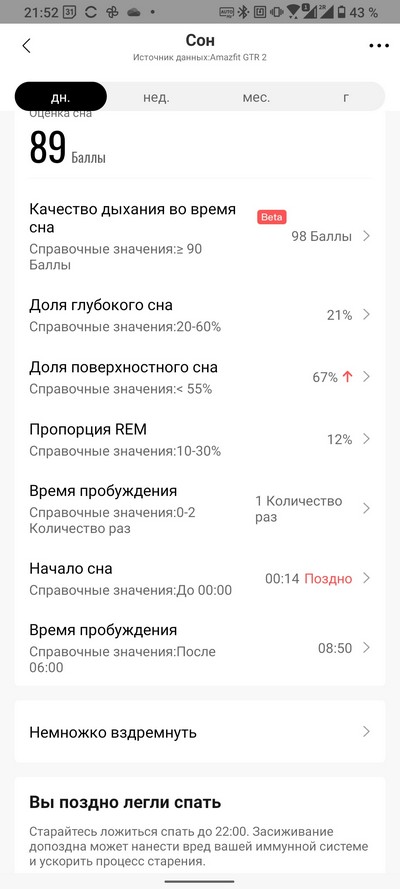 Отслеживание уровня оксигенации крови - очень так себе. Как, замечу, и на остальных часах, которые у меня были. Во-первых, замер делается долго - порядка минуты. (Обычное копеечное устройство уровень довольно точно измеряет секунды за три.) Во-вторых, достоверность данных - достаточно низкая. Ну, точнее, более или менее достоверные данные можно получить, если очень жестко выполнять соответствующие условия: ремешок должен быть туго затянут, рука должна неподвижно лежать на поверхности, циферблат должен смотреть строго вверх - вот тогда показания более или менее похожи с теми, которые выдает пульсоксиметр, и отличаются максимум на 1-2 единицы. Но стоит хоть в чем-то отойти от соответствующей процедуры (ремешок не туго затянут, рука на весу, рука слегка двигается во время измерения) - часы могут выдать что-то вроде 91-92, а с таким показателем оксигенации, как правило, уже требуется госпитализация. Поэтому или жестко выполнять соответствующие требования и при этом получать более или менее достоверные данные, или не проводить такие измерения. У обычного пульсоксиметра таких проблем нет: сунули палец, нажали кнопку, через 3-4 секунды получили результат.