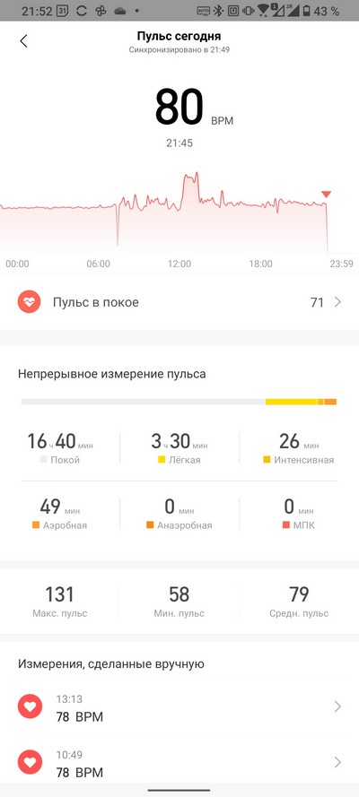 Отслеживание пульса в обычном режиме - в общем, вполне неплохо, более или менее совпадает с данными пульсоксиметра и тонометра.