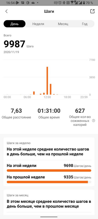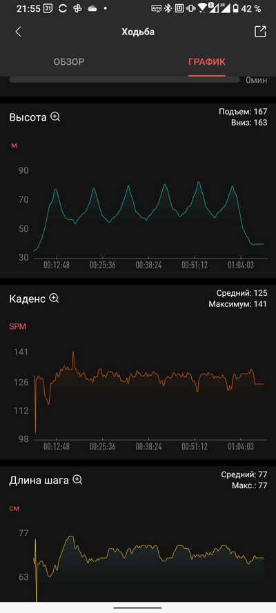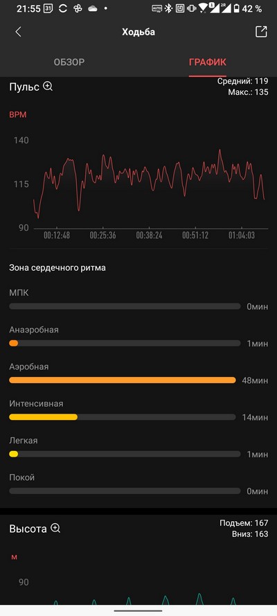 Далее возникли проблемы с пульсом: в обычном состоянии часы измеряют более или менее четко, но на тренировке начинают выдавать какие-то бешеные 150-170 ударов, что при моей нагрузке просто не может быть (я знаю, что у меня во время прогулки с палками пульс обычно 110-120, максимум - 130).