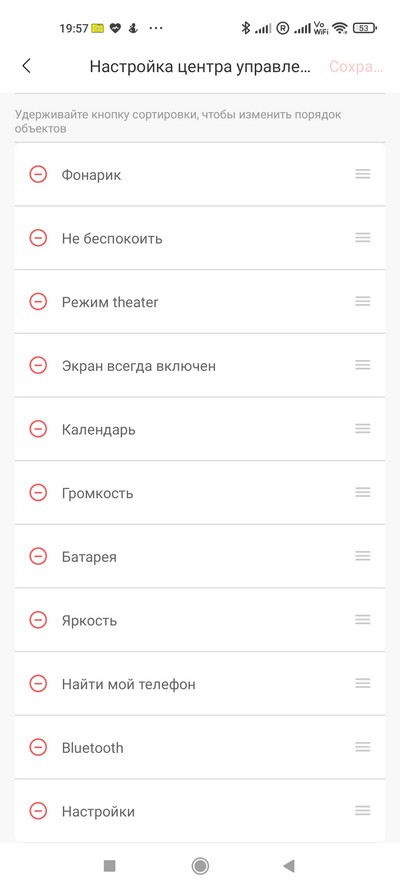Настройка центра управлений - это тот самый выбор порядка следования списка приложений, который появляется по нажатии верхней кнопки.