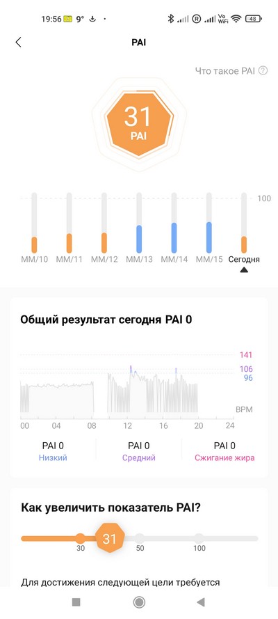 PAI - уровень активности, там же выводятся зоны частоты пульса и распределение активности.