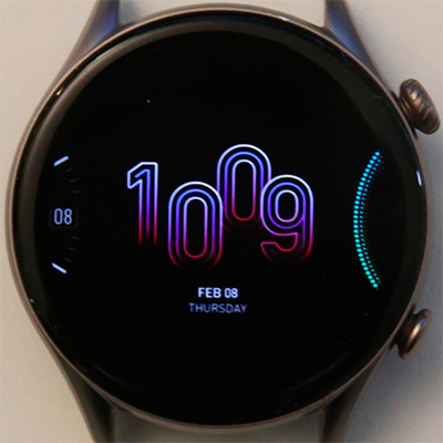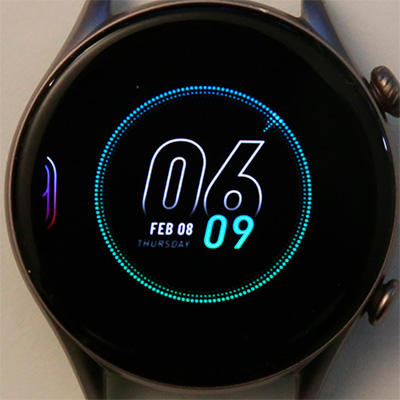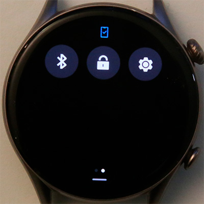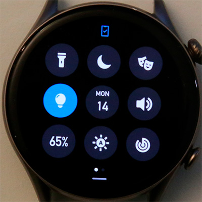 Свайп от циферблата вниз - информационные данные (дата, день недели, заряд аккумулятора, погода, сопряжение со смартфоном) и пиктограммы переключателей: фонарик, настройка дисплея, режим "Не беспокоить", энергосберегающий режим (при этом на экране будут только уровень заряда, дата, время и количество шагов, также часы будут отслеживать сон; постоянно включенного экрана не будет, активизироваться часы будут только по кнопке), блокировка экрана от нажатий (для плавания), поиск телефона (он будет звонить), настройка громкости динамика, режим "Театр" (яркость экрана гаснет, и отключаются режим постоянно включенного экрана и включение циферблата подъемом запястья) и постоянное включение дисплея в полном режиме (это работает только ограниченное время).
