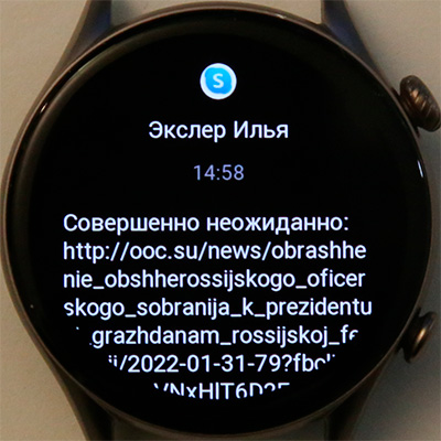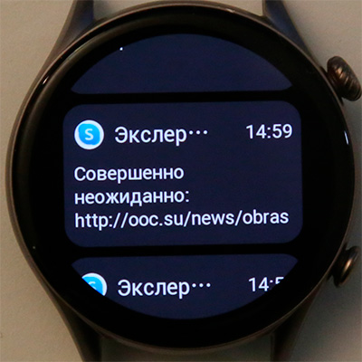 Свайп от циферблата вверх - список полученных уведомлений, нажатие по уведомлению - вывод его целиком для прочтения. Отвечать на уведомление предустановленными сообщениями эти часы пока не научились. (А вот Huawei Watch GT 3 такое уже умеют, и это нужно многим пользователям.)