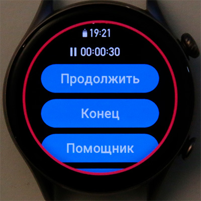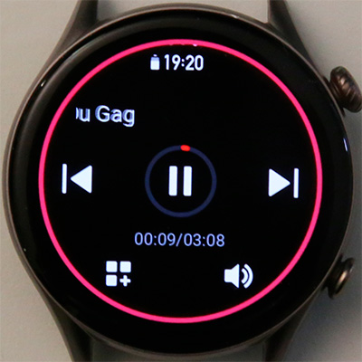 При тренировке свайп влево - аудиоплеер, который может как управлять музыкой на смартфоне, так и проигрывать музыку с часов, причем и через свой динамик (на удивление громкий), и через подключенные по Bluetooth наушники. (Красная окружность означает, что тренировка поставлена на паузу. Эти часы умеют автоматически приостанавливать тренировку в случае отсутствия активности, и это очень удобно.) Свайп вправо - управление тренировкой.