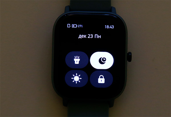 Свайп циферблата вниз - быстрые настройки: значок подключения к смартфону, уровень заряда, дата и время, включение-выключение фонарика, настройка яркости экрана, блокировка и режим "Не беспокоить", который имеет четыре состояния: отключен, включен, умный режим "Не беспокоить" (уведомления не поступают, когда вы спите), режим явного задания временного промежутка (что очень даже актуально). Яркость экрана можно выбирать из нескольких уровней или включить режим автоматической подстройки.