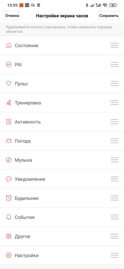 Смена циферблата делается при длинном нажатии на экран. В памяти часов хранятся только три циферблата, но любые из них можно загрузить через приложение. Некоторые фирменные предустановленные циферблаты гибко настраиваются: например, у циферблата ниже на экране пять информационных блоков и в каждом из них вы можете выставлять тот вид информации, который вам нужен (например, вместо длинного блока с пульсом можно выставить погоду, уведомления, напоминания, активность).