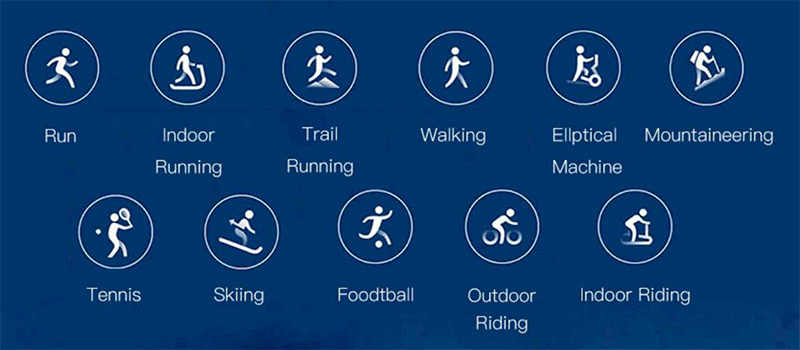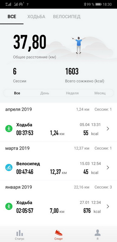 Здесь поддерживаются одиннадцать видов активностей: бег, бег на беговой дорожке, бег по пересеченной местности, ходьба, занятия на эллипсоиде, ходьба по горам, теннис, лыжи, футбол, велосипед, велотренажер. Плавание, подчеркиваю, не поддерживается.