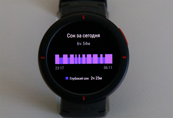 Здесь история такая. Режим "сна" есть, но достаточно условный: для скинов со стрелками выводятся еле видные стрелки, для скинов с цифровыми часами - цифровые часы. Это все очень бледно и видно только при неярком окружении. Скажем так, у самсунговских часов на Tizen спящий режим был более информативный. А, например, у Huawei Watch GT спящего режима нет вообще.