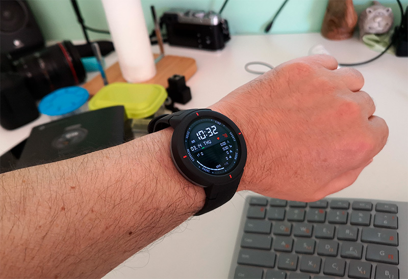 Корпус Amazfit Verge выполнен из ударопрочного пластика очень хорошего качества. Устройство позиционируется как спортивные часы, ну и на руке смотрится как типичные спортивные часы. Дизайн слегка интереснее, чем, например, у Garmin Vivoactive, но те же Huawei Watch GT смотрятся заметно эффектнее.