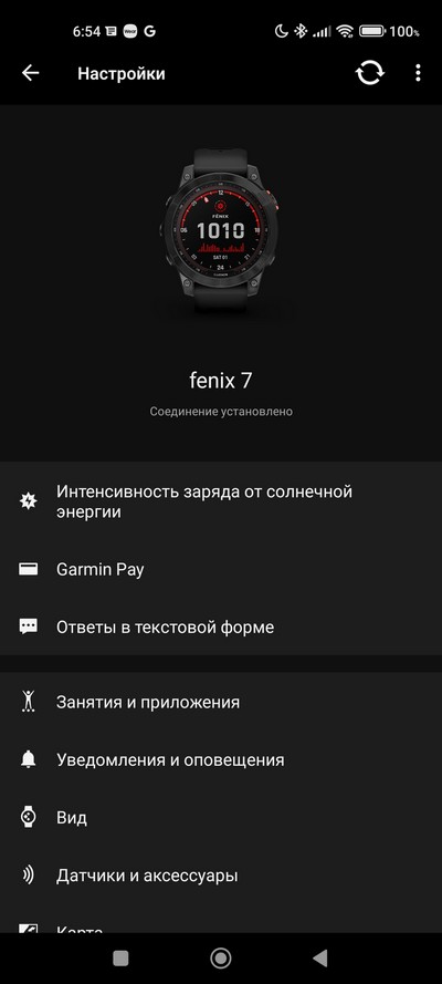 Главная страница настроек часов, интенсивность заряда от солнечной энергии.