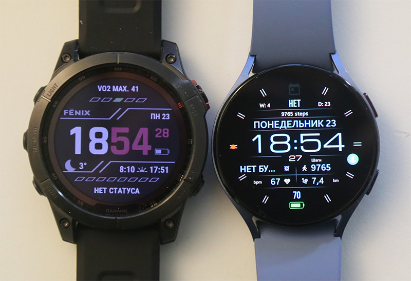 Ну и вот эти часы рядом с моими Galaxy Watch5. Не скажу что они выглядят намного более громоздкими по сравнению с Watch5. Более спортивно - да, выглядят. И они заметно толще.