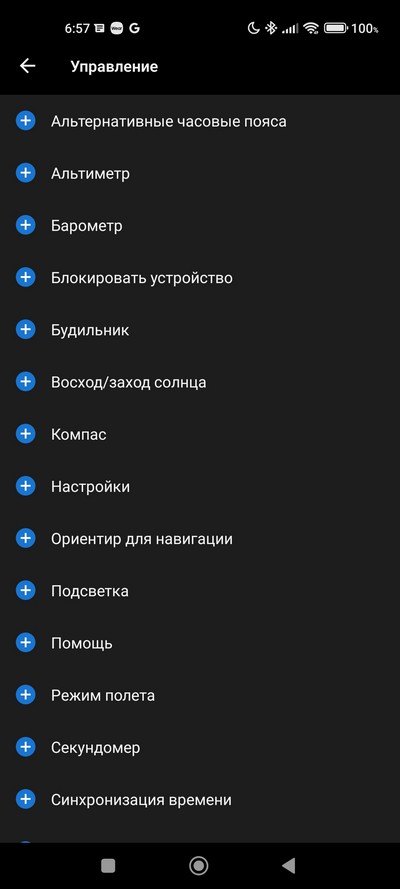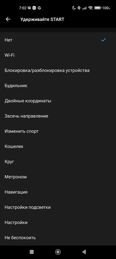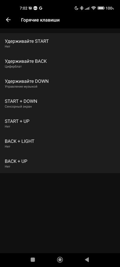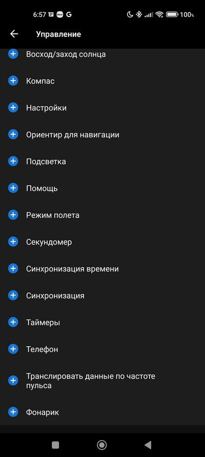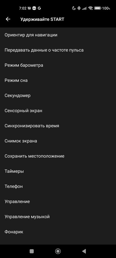 Длинное нажатие на кнопку подсветки - меню элементов управления. Его тоже можно как угодно редактировать. По умолчанию там установлены: выключить питание, управление музыкой, найти телефон, сохранить местоположение, заблокировать кнопки, включить режим "не беспокоить", синхронизировать с телефоном, подключить-отключить телефон, включить режим энергосбережения.