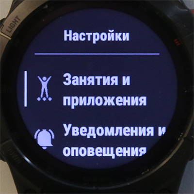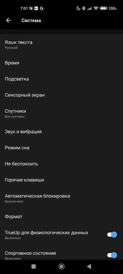 Настройки - тренировки, уведомления, датчики, карты, музыка, беспроводная связь, голосовые подсказки, профиль пользователя, отслеживание и безопасность, здоровье и благополучие, навигация, диспетчер энергопотребления, системные настройки. В настройках системы кроме всего прочего настройки подсветки для спорта, сна и обычного использования.