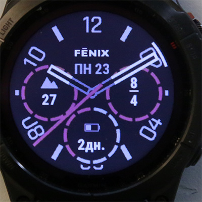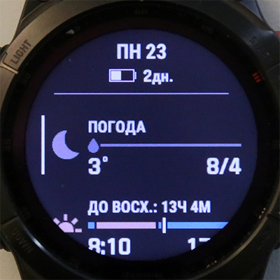 3. Из плюсов. Самый жирный плюс - автономность. 20 дней - без проблем. Производитель заявляет бесконечный режим работы от солнца, но в моих краях это проверить не очень получается. Это настолько "фича" этой версии, что даже заряд оно отображает в днях, а не в %. Дополнительный плюс - тут есть все тоже, что и в "больших" Garmin, кроме фич, которым нужна память. Заявлена защита по MIL-STD-810.